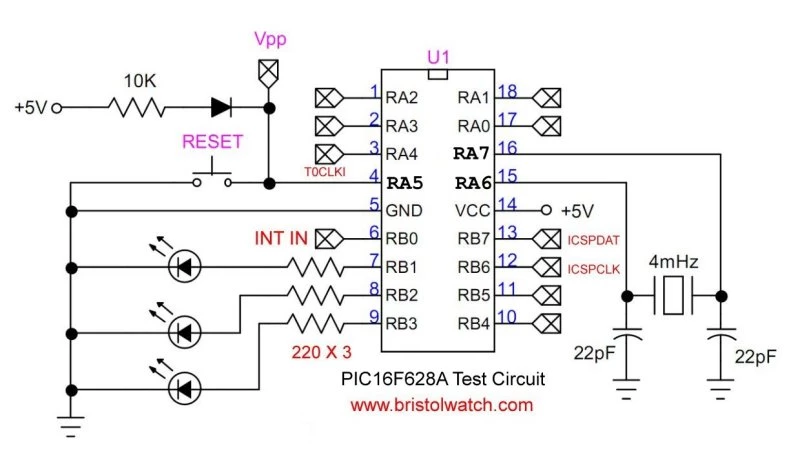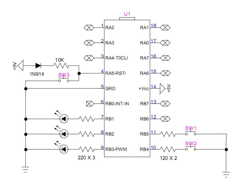 This example shows how to use the PIC16F628A’s RB port change interrupt to detect and debounce a button press on RB4. The button connects between RB4 and ground, with the internal pull-up enabled. A 120Ω resistor is added in series with the switch to protect the pin if misconfigured as an output.