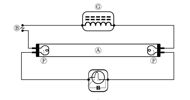In a classic preheat fluorescent circuit (choke ballast + glow-bottle starter), the small capacitor inside the starter is wired across the starter’s contacts. It acts as a snubber: reduces contact arcing and suppresses radio-frequency noise. It is not the same as the large power-factor correction capacitor sometimes found across the mains in fixtures.